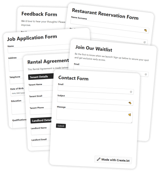 I made Create.ist form builder compatible with the ecosystem, so you can connect it to anything with Zapier, Make, IFTTT, or n8n. Via webhook. Such as, by creating a simple contact form, you can send an AI written email to someone when their form is full.